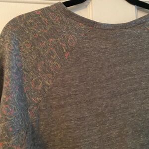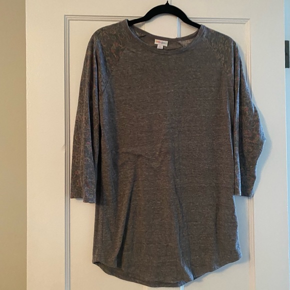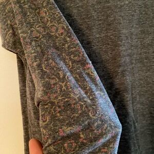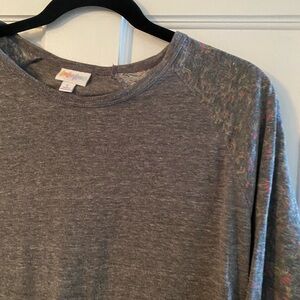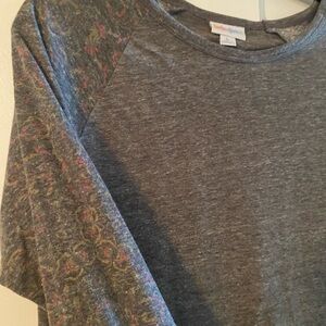 Chic LuLaRoe top with gray body and floral raglan sleeves. Ideal for everyday comfort.