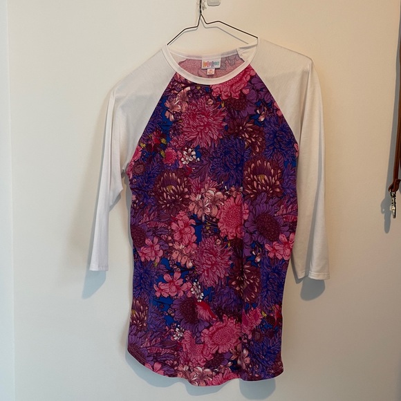 LuLaRoe Randy raglan-style top with pink, purple and white floral pattern