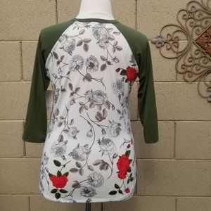 Cream and green leaves, grey and red roses on a white background. Army green sleeves and neckline to match! 3/4 Raglan sleeves perfect for layering.