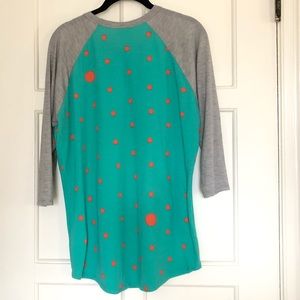 This is a gently worn LuLaRoe Randy tee, size L. This turquoise and coral baseball style shirt has 3/4 length sleeves. This shirt was a little big on me but, I love the colors, so I had to have it! I only wore it once or twice, and washed it according to manufacturer’s washing instructions.