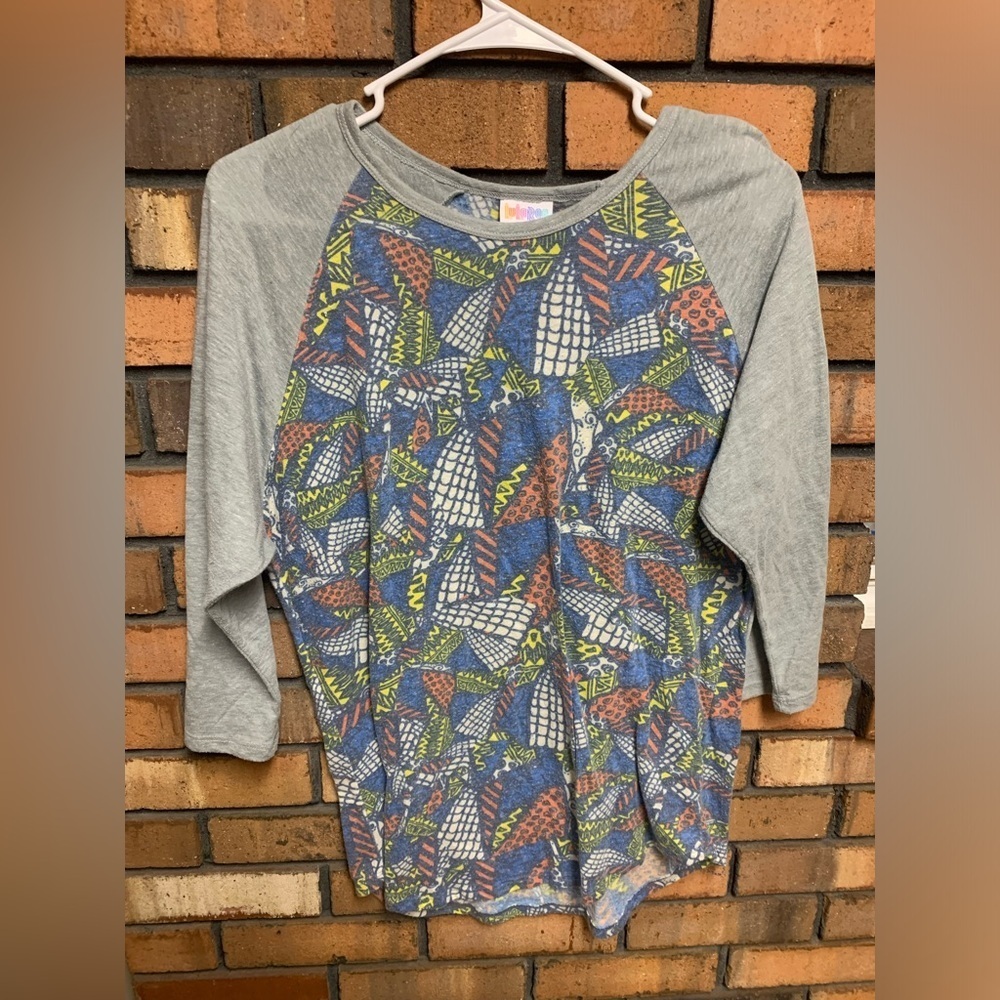 Stylish long sleeve top with geometric patterns. Features gray sleeves and a vibrant blue design. Perfect for casual wear.