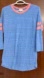 3/4 length sleeves, Heathered Blue body with Orange sleeve stripe accent, neckline trim same color