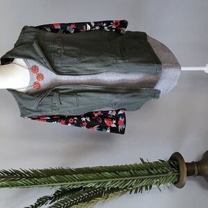 Black 3/4 sleeves with red, pink, turquoise, and white floral print