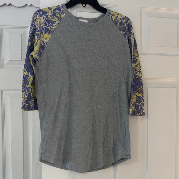 Stylish LuLaRoe top. Gray body with vibrant blue and yellow floral sleeves. Comfortable and chic.