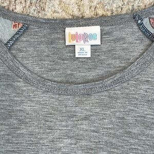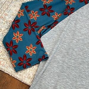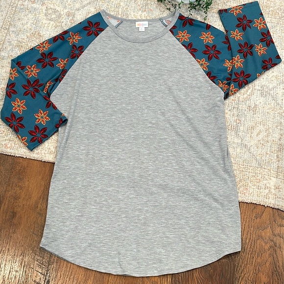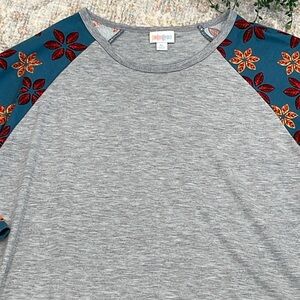 LuLaRoe Randy tee with Heather gray body with teal green, orange, red and yellow sleeves, size XL.