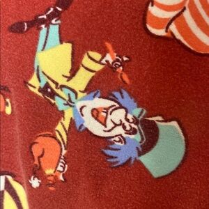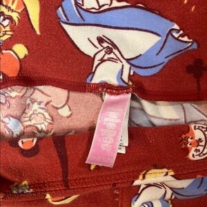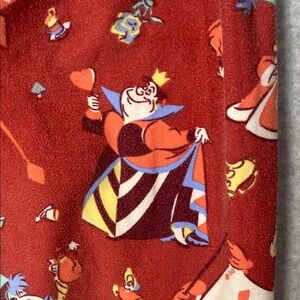 Bold red leggings with whimsical cartoon characters. Ideal for a playful style. Color may vary from picture.