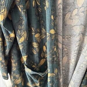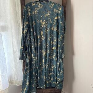 Elegant long cardigan with floral pattern. Features green and gold colors. Perfect for layering. Has pockets and a ribbed texture.