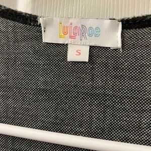 LuLaRoe Sarah Black and White Cardigan - Size Small - This sporty cardigan/duster has only been worn once. (I ordered the wrong size, and there were no returns for the item.) Product Details: *Cropped long sleeve *Mid-calf length *95% Polyester *5% Spandex My Stylist Tip: Layer it over a tee with chunky layered bracelets, faded, distressed jeans and black ankle boots. ________________________ It seems to run a tad small in the shoulders (or maybe that is just me). It is a flannel-type material and is perfect for the upcoming winter months. It would look adorable paired with a turtleneck or tee and your favorite distressed jeans. Even throw on a red scarf for a pop of color! :) I only wore it once for about a half day. The only flaw you will find is the label came off on one side as soon as I put it on....It must have been loose already? You will see in the photo. I put two simple black stitches on it to secure it, and it is as good as new, I promise.