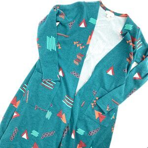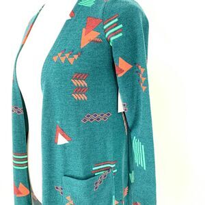 LuLaRoe Sarah Teal geometric print cardigan duster, size XS