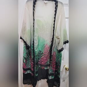 Elegant sheer kimono with vibrant leaf design. Features black lace trim for added style.