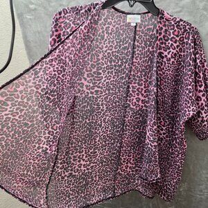 Fierce & flowy! This LuLaRoe sheer kimono cardigan in pink cheetah print adds a bold statement to any outfit. Lightweight and perfect for layering year-round. Size 3 with a relaxed fit.