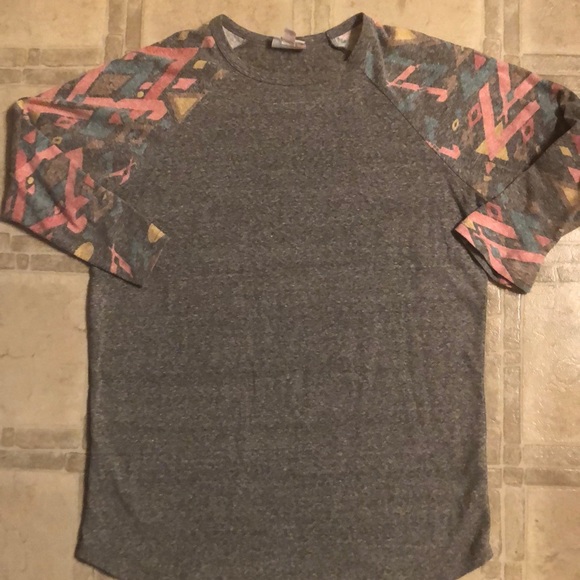 Super Comfy, Super Cute the LuLaRoe Randy is a perfect shirt! With a baseball tee look-this grey and patterned sleeve Randy goes with a ton of stuff! Look cute and comfy! Size small