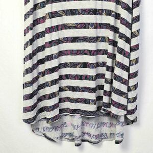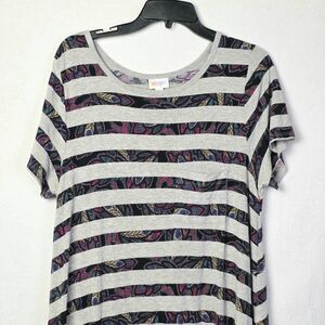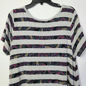 LuLaRoe women’s Carly dress, size Large. Features gray and black horizontal stripes with colorful paisley print accents, short sleeves, high-low hemline, and front pocket. Super soft and stretchy fabric blend of 48% rayon, 48% polyester, 4% spandex. Perfect casual everyday dress.