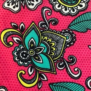 Bright pink leggings with a colorful paisley floral pattern. Features green, black, and white accents.