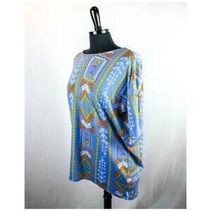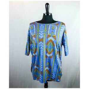 LuLaRoe tunic top in periwinkle blue with orange, yellow and white geometric print
