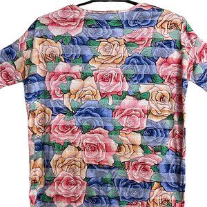 Features: pullover, stretch, knit, high low length, mid length fitted sleeves, loose, casual, workwear, everyday, longline, rose print, all over print, colorful, multicolor, tunic, poly blend