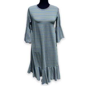 LuLaRoe Womens Dress Size M Maurine Green Blue Striped Swing Bell Sleeves NEW