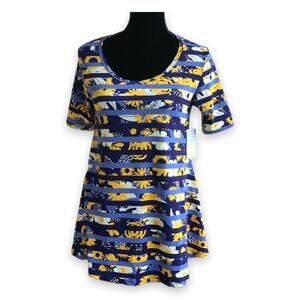 LuLaRoe Womens Perfect T Size XXS Blue Navy Yellow Cream Floral Stripe Top NEW