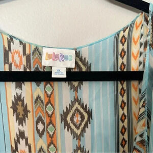 LuLaRoe Women’s Short Sleeve Drape Open Front Blue Aztec Print Kimono Sz XL GUC