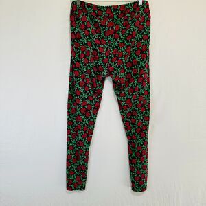 LuLaRoe Women's Tall & Curvy Leggings Red/Green Floral Pattern Black Background. Good pre-owned condition, no rips, tears, or stains.