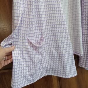 The LuLaRoe Women's Violet/White Soft Knit Long Open Cardigan with Pockets in size M is a versatile and stylish sweater perfect for various occasions. Made from a blend of polyester, spandex, and rayon, this cardigan features a geometric pattern in shades of purple, making it a great addition to your wardrobe. With long sleeves and a lightweight design, it is ideal for travel, casual outings, or workwear. The open front and pockets add practicality to this classic and comfortable piece, making it a must-have for the warmer seasons of summer, fall, and spring.