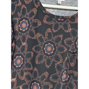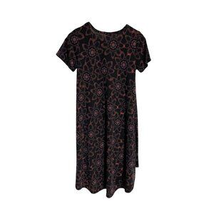 This LuLaRoe dress presents a polished floral design in black and red. Crafted from a blend of polyester and spandex, it ensures a comfortable fit. Short sleeves and a round neckline add to its versatile style, ideal for both casual and professional settings.
