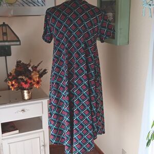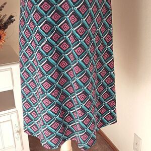 This great little dress is comfortable and easy. "A" shaped shift. Geometric design. Short sleeves. Size M measures 40 at chest, 46 at waist, 56 at hips, 38 long from shoulder to hem. 5 inches longer in back. Just pull on and go, easy breezy.
