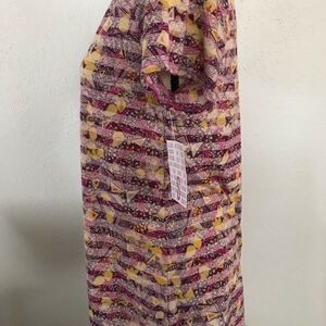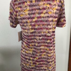 LuLaRoe Classic tee with ghost stripes with pink yellow, off white, and grey colors. This style sits a little longer in the back, and looks fabulous with skinny jeans! Comes from a smoke free home