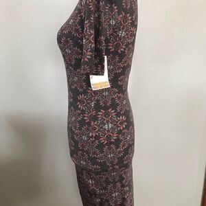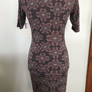 LuLaRoe XXS Julia dress with Aztec type pattern with charcoal grey background and light grey and light coral pattern. Style is a little more form fitting, but this material is super soft and forgiving. Comes from a smoke free home.