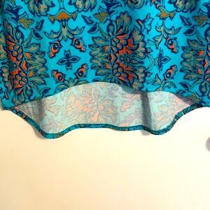 LuLaRoe aqua and orange print Irma tunic size XXS. Pretty print long tunic is new without tags. Longer in back than in front. About 24 inches from under one arm to the other. About 28 inches from shoulder seam to hem in front and 32 inches long in back. Sleeve width at end of sleeve measures 4 5/8 inches across laid flat. NWOT. Bundle with more items from my closet to save.