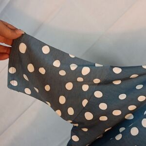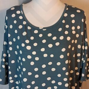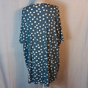 This blue and white Polka Dot short sleeve LuLaRoe high low Tunic is a size XL with a pit to pit measuring 27" and a front length of 30" and a back length of 34". In excellent condition. All offers are welcome.
