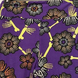 LuLaRoe Purple Halloween Skeleton & Bones Leggings, One Size. Excellent used condition. One tiny water stain on bum (as pictured). No pilling. Super soft and cozy! Fits size 0-12.