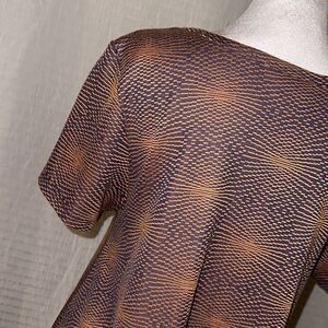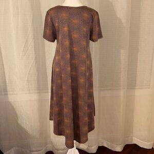 LuLaRoe S Carly Burnt Orange Indigo Blue Knit Crewneck Short Sleeve Hi Low Dress