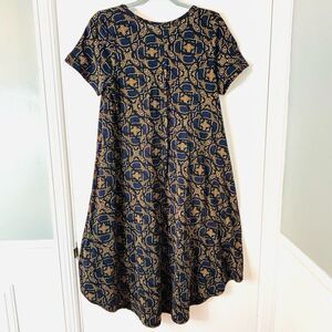 LuLaRoe S Carly Swing Dress Navy & Gold Geometric Print with Breast Pocket