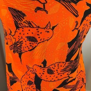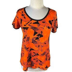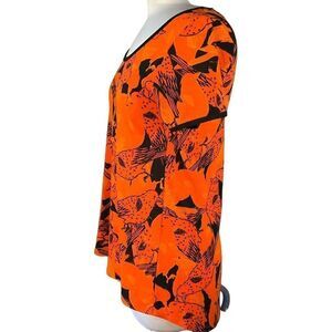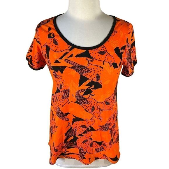 Lularoe Perfect Tee. Tag says XXS, but runs bigger. Please see measurements. Hi/lo.bright orange, scoopneck, rounded hems, banded. Birds all over. I see pigeons, but… Flat lay length 24” f, 27” b, 15.5” p-p. Like new condition. #birds #modest #halloween