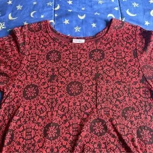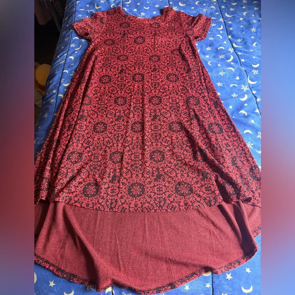 LuLaRoe knit high-low dress with red and black woven pattern. Lightweight, stretchy, & breathable fabric. Simple crew neckline. Has a breast pocket for detail. Very flowy. I love this dress for both summer & winter wear! Bust: 18 inches. Lower length: 39 inches. Back length: 46 inches. Used, but in great condition!
