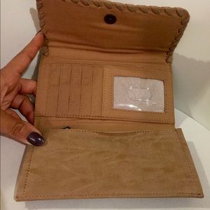 Vegan suede w/ braided trim details around the edges; blue and orange stone & gunmetal embellishments on front; magnetic snap closure; Interior zip pocket & four side slip pockets; Seven credit card/ID holders in center