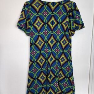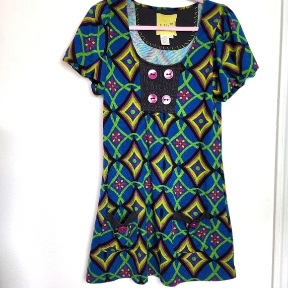 LuLu Via Tunic Blue Yellow Graphic Design Pockets Women's Mini Dress Size L