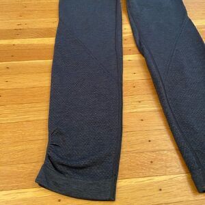 LuLuLemon Seamless Crop Cinched Navy Leggings. Logo on back. Waist across front 12 1/2 inches. Rise 8 inches. Inseam 21 inches. No size tag. Size 4 (size located in right leg hem). Excellent condition!