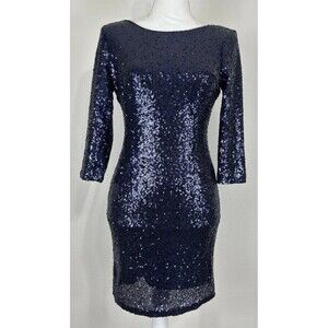 This bodycon dress is covered with beautiful shining navy sequins, for a classy modification. The rounded neckline has a scooping back and three-quarter sleeves, with princess seams starting on the fitted bodice and continuing down the bodycon skirt. Hidden back zipper/clasp.