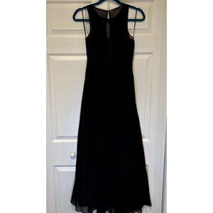 This LuLus dress in approximately size XXS features a solid black chiffon fabric with embroidered accents. The dress has a sweetheart neckline, sleeveless design, and a long maxi length with pleated chiffon skirt detailing. It has a zip closure and is made of a polyester blend material, perfect for formal occasions like weddings or parties. The elegant design exudes a flattering and sophisticated style.