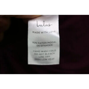 LuLus Purple Jumpsuit-High Slit Both Legs-Belted-Size Medium. The material is 95% Rayon and 5% Spandex. Laying flat measuring armpit to armpit it is 17.5'' and the inseam is 35''.