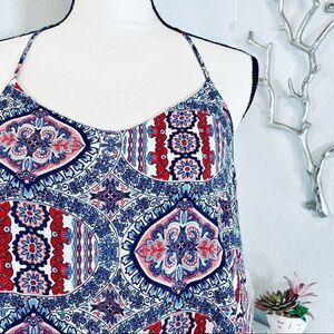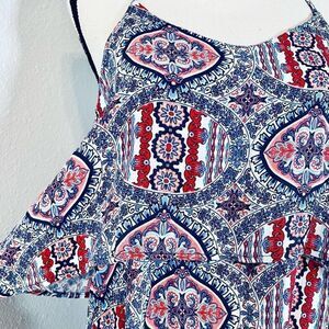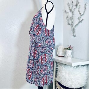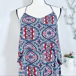 Lulu’s boho style dress. Ruffle top that falls mid waist and has a layer underneath. Sleeveless with scoop neck line.