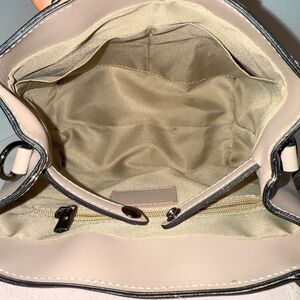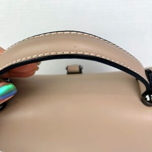 Luana Ferracuti made in Italy leather convertible backpack in beige nude. This chic top handle bag can be worn as a backpack, shoulder bag, or with just the top handle. Gunmetal hardware with top flap and turnlock clasp closure. Fabric lined interior includes 2 slip pockets, a zip pocket, and a center snap closure strap to cinch the bag in. Chic and fantastic for any occasion with a quiet luxury look the perfect neutral shade to go with all your looks! Two adjustable cllip on straps allow you to get the perfect fit however you want to wear this purse! Excellent used condition - tiny mark to handle from edgecoat manufacturing, very minor wear to bottom feet, small mark to interior fabric, all pictured. Approximate measurements: 8"L x 9"H x 5"D, 33" max length for each strap.