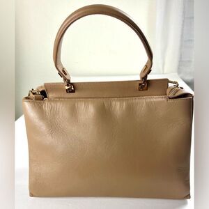 Luana made in Italy double zip satchel/crossbody bag. This elegant tan leather handbag is perfect for any occasion. Its sleek design and neutral color make it a versatile addition to your wardrobe. Crossbody strap is adjustable and removable. Clean inside with minor, normal wear as seen in photos.