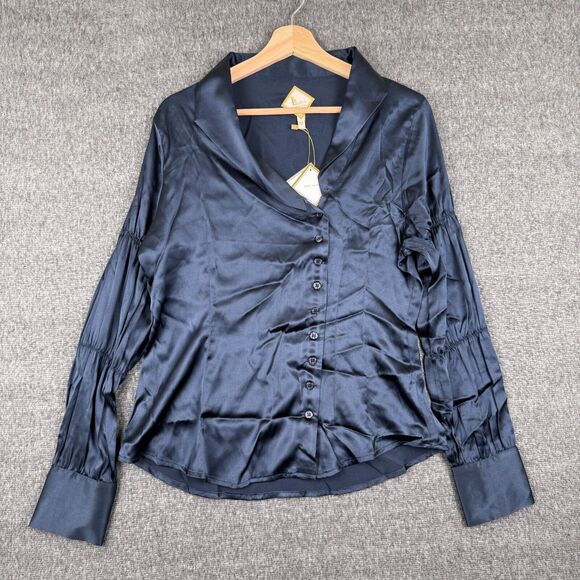 Luba Cellini Silk Top Women's 10 Blue Button Casual Business Long Sleeve NWT