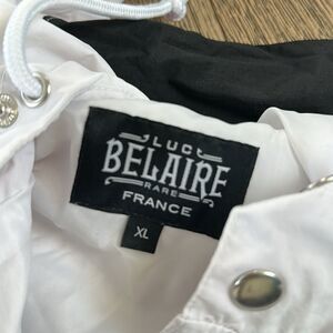 This Luc Belaire rare France windbreaker is a men’s extra large and is in excellent condition. A rare find and great streetwear unisex collectible. Features bold pink stripe with BELAIRE across the front and four snap closure at the neck. Drawstring windbreaker hood. Each sleeve has two snap closure to customize fit. Front pockets. Lined with a longer back hem. Back pockets with fold over flap and hook accent. Comfortable and trendy clean and like new. Men’s XL