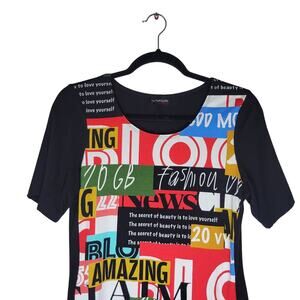 Luc Fontaine Mini Dress Womens Size 8 Black Graphic Print Stretch Short Sleeve Scoop Neck Split Hem Tunic Art To Wear Tunic Positive Artsy "Love Yourself"