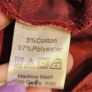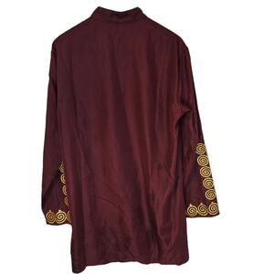 Slim fit tunic and pants. Burgundy red with gold printed detail. Top is 1/2 button down with Mandarin collar.Pants have side slit pockets, elastic and drawstring waistband. 97% polyester, 3% cotton