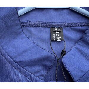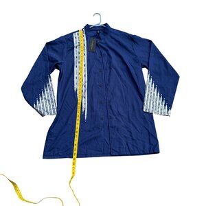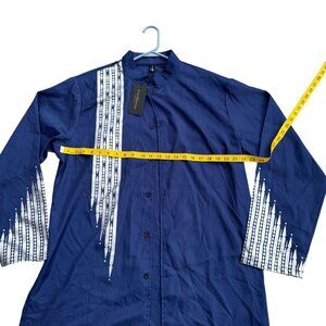 LucMattan men's button-down shirt in navy blue, size XL, made of comfortable cotton. Features intricate printed white geometric patterns on the chest and sleeves. Mandarin collar with buttons along the front. Long sleeves and a straight-fit silhouette. New with tags for a modern and stylish outfit option.